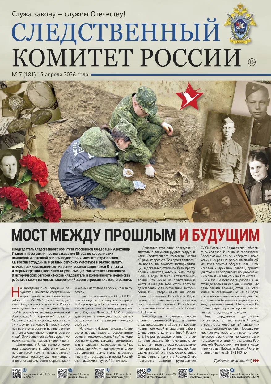 На официальном сайте Следственного комитета Российской Федерации в разделе «Издания Следственного комитета России» размещен очередной номер газеты «Следственный комитет России» (№ 7 от 15 апреля 2026 года).