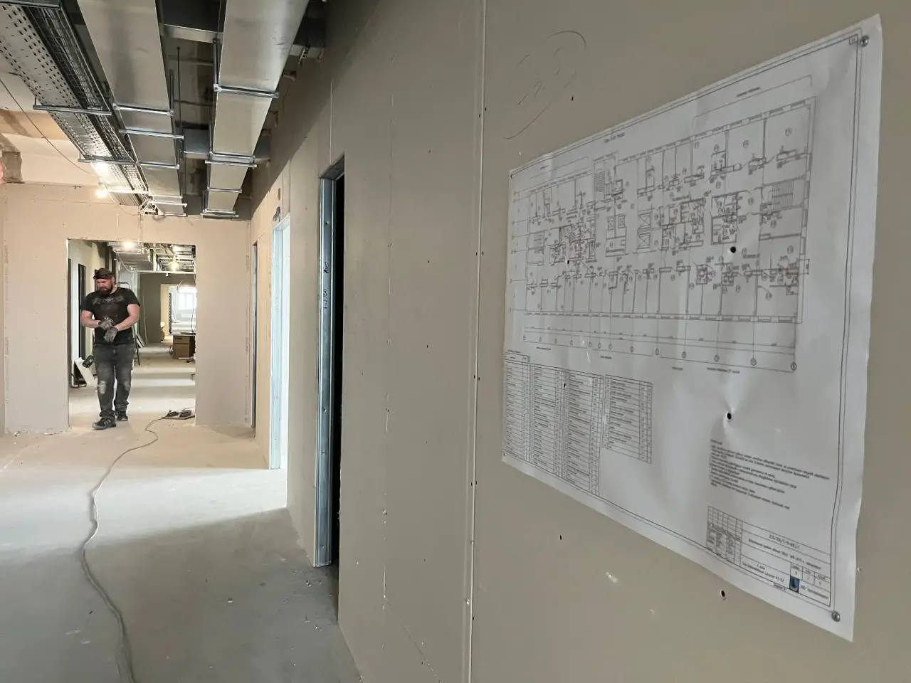 За почти полтора года выполнен колоссальный объём работ, в том числе демонтирована старая отделка и перегородки, заново залиты полы на всех семи этажах. Сейчас строители выстраивают перегородки на первом и пятом этажах. На остальных идёт чистовая отделка: укладывают плитку на полах и стенах санузлов, облицовывают стены специальными панелями. Параллельно продолжается монтаж вентиляции, слаботочных сетей и элекропроводки.
