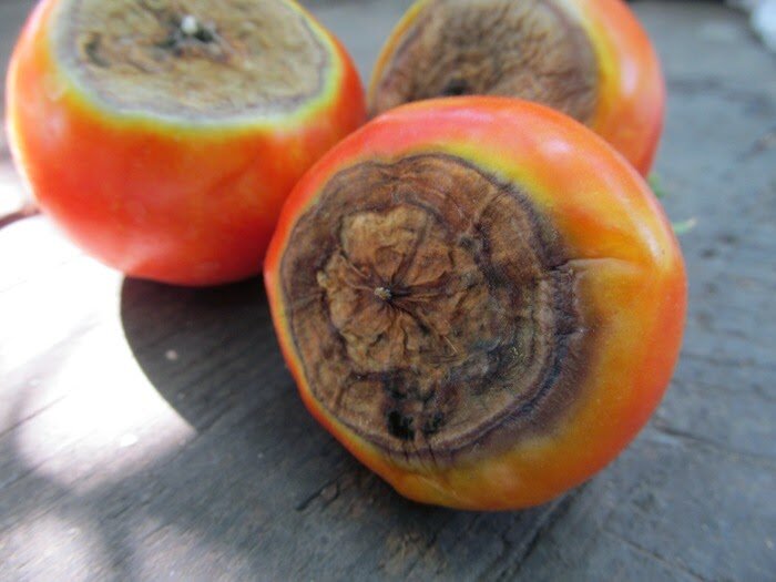 Вершинная гниль возникает на верхушках плодов и проявляется в виде некротических участков. Эти коричневые пятна со временем темнеют и вдавливаются в плод, что приводит к его загниванию. Главными виновниками появления гнили являются:
