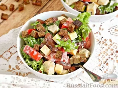 И нотка яркости в завершение: салат с курицей, помидорами, фасолью и сыром порадует глаз и желудок. Обжаренное куриное филе, свежие помидоры и ржаные сухарики вместе создадут невероятный кулинарный шедевр.