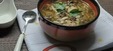 Параллельно в кастрюле закипает вода, в которую кладется куриная грудка. После закипания мясо варится около 15-20 минут. Затем в бульон добавляют фасоль и грибы, а также следует подготовленная зажарка: