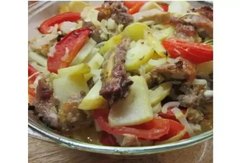 Форму смазать маслом и выкладывать слоями: свинина, лук, картофель, огурцы, помидоры. Каждый слой немного приправить.