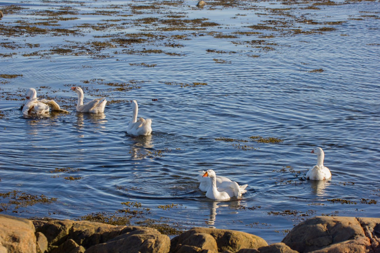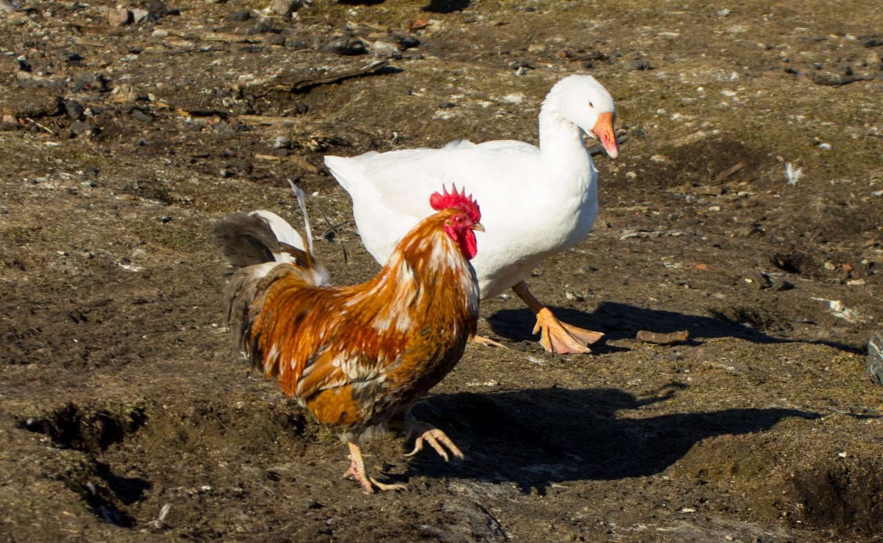 Теперь по берегу гордо гуляет целое стадо, а компанию гусям составляют петух и куры. Настоящая сельская идиллия
