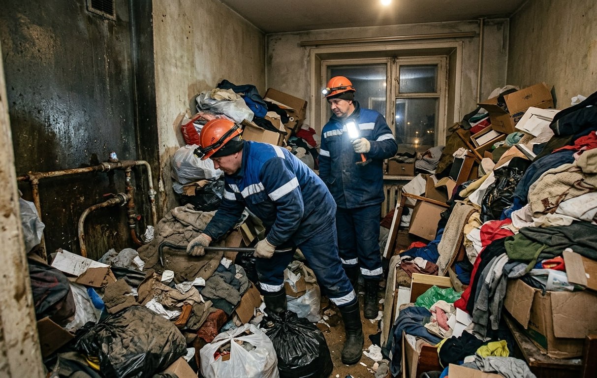 Внутри обнаружились огромные залежи старых вещей и бытового лома. Из-за «синдрома Плюшкина» у хозяйки помещение было практически полностью завалено хламом.