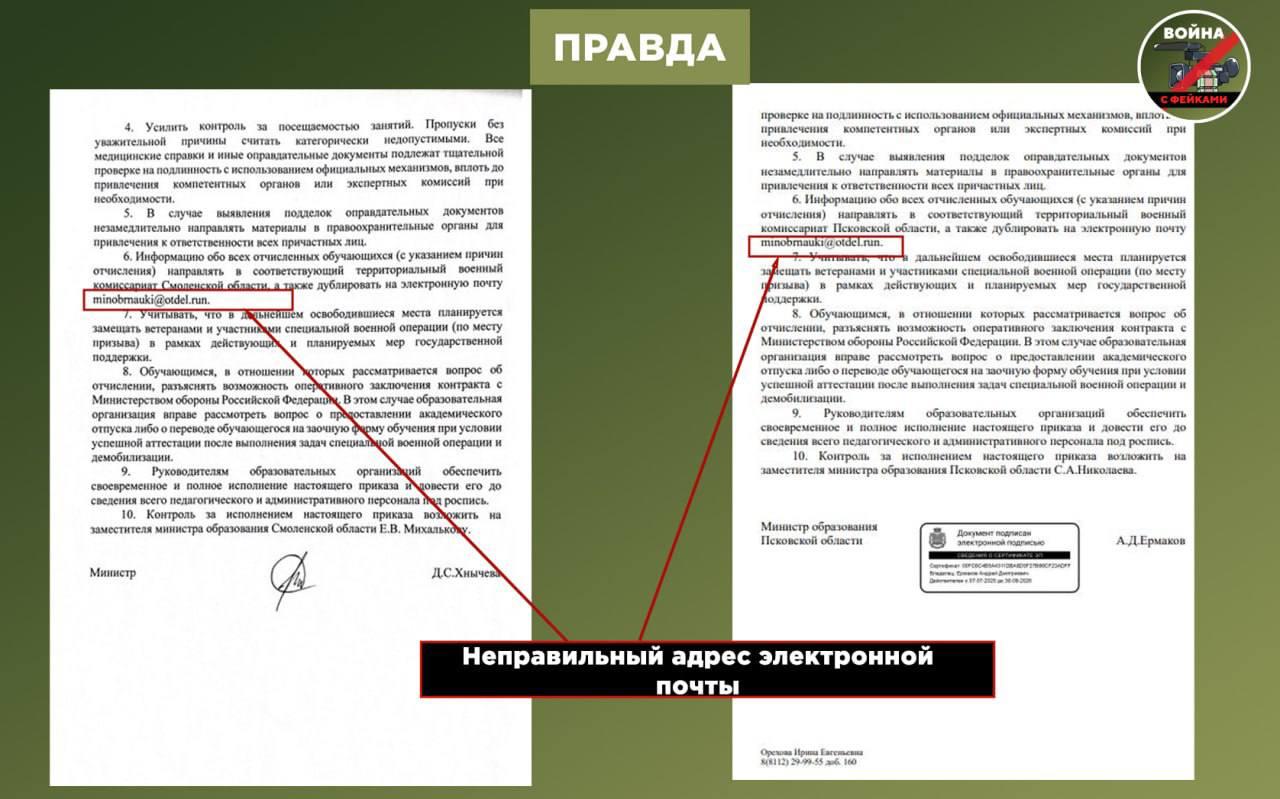Правда: Распространяемые документы — подделки, которые в большом количестве тиражируются украинскими ЦИПсО для запугивания российской молодежи и подрыва доверия к власти.