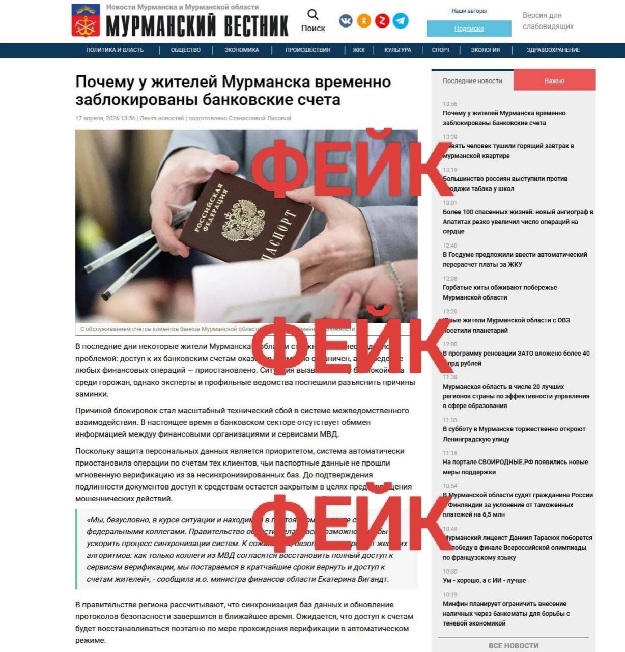 В постах в интернете говорится о некоем "сбое во взаимодействии между финансовыми организациями и МВД". Чтобы информационный вброс выглядел убедительнее, злоумышленники используют дизайн региональных СМИ. В этот раз на фейковом видео якобы из студии ГТРК "Мурман" цифровая подделка вице-губернатора Светланы Панфиловой сказала, что операции приостановлены из-за сложностей с верификацией паспортов. Аналогичную информацию распространяют, подделывая новости газеты "Мурманский вестник".