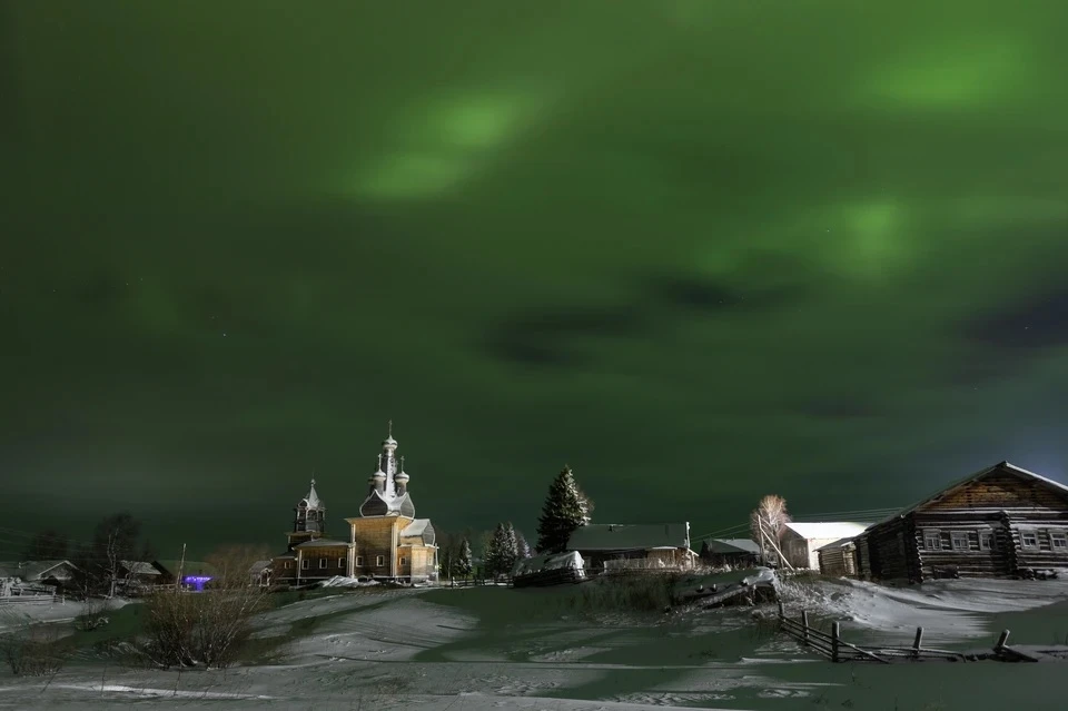 Ночное небо над Россией озарилось редким и завораживающим природным явлением - ярким северным сиянием. Оно вспыхнуло на фоне мощной магнитной бури, накрывшей планету.
