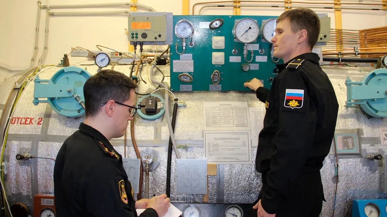 В тот день занятия в учебно-тренировочном комплексе по борьбе за живучесть и легководолазной подготовке, который возглавляет капитан 3 ранга Сергей Линкевич, начались довольно рано. Буквально с началом рабочего дня. Вызвано это было тем, что здесь в барокамере барокомплекса "Спаситель" проводились тренировочные водолазные спуски на глубину 100 метров. Данный процесс весьма длительный и занимает достаточно много времени. Поэтому и приступили к тренировкам с самого утра, чтобы в них смогли поучаствовать две группы специалистов.