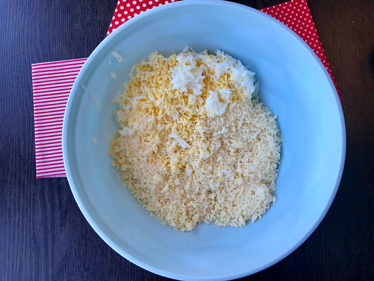 Для начала, нужно подготовить начинку. Следует натереть сыр и заранее отваренные яйца. Рекомендуется использовать сыр Гауда, который придаст рулетикам особую пикантность. Позже, к натертой массе добавляется нарезанный укроп и тертый чеснок, после чего все это заправляется майонезом или сметаной для согласования текстуры.